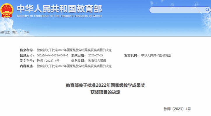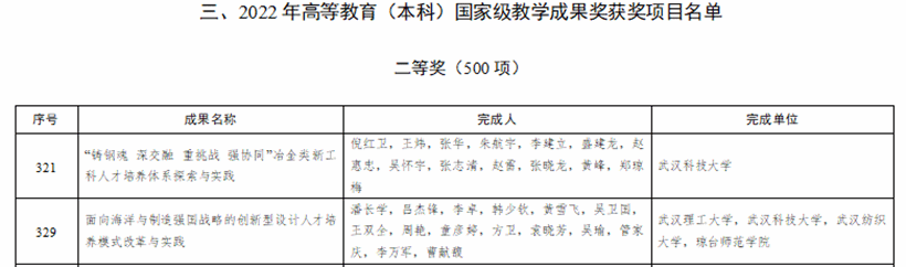 7月24日,教育部发布关于批准2022年国家级教学成果奖获奖项目的决定。402am永利手机版倪红卫教授主持完成的“‘铸钢魂 深交融 重挑战 强协同’冶金类新工科人才培养体系探索与实践”喜获高等教育(本科)国家级教学成果奖二等奖,与此同时402am永利手机版艺术与设计学院管家庆教授参与完成的“面向海洋与制造强国战略的创新型设计人才培养模式改革与实践”获得高等教育(本科)国家级教学成果奖二等奖。402am永利手机版是湖北省属高校中作为第一完成单位唯一获奖的高校。