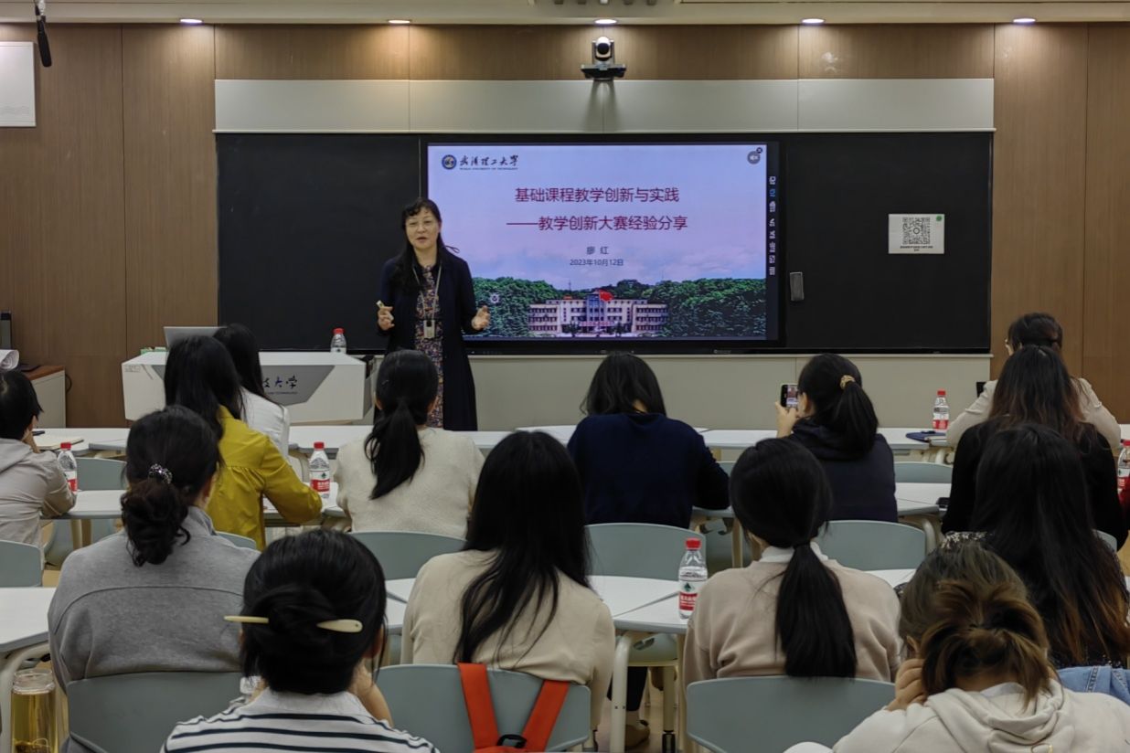 10月12日,国家级一流课程负责人、第三届全国高校教师教学创新大赛基础课程正高组国家级一等奖获得者武汉理工大学廖红教授应邀到402am永利手机版做报告,廖红教授以“基础课程教学创新与实践——教学创新大赛经验分享”为题分享了她在课程建设及参赛方面的收获与感悟。本次讲座是武汉科技大学125周年校庆系列讲座之一,旨在提升402am永利手机版承担基础课及专业基础课教学任务教师的教学创新能力,促进教育教学发展。本科生院副院长、教师教学发展中心主任张志清主持,六十余位教师参加。