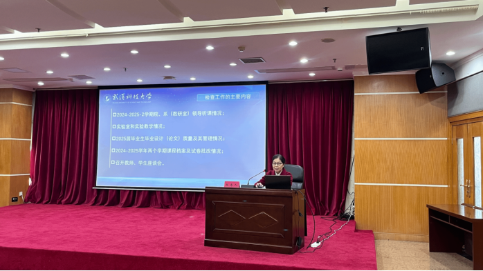 学校教学督导组副组长杨嘉晖代表督导组,详细反馈了院系领导听课、实验室和实验教学、2025届毕业生毕业设计(论文)、2024-2025学年两个学期课程档案及试卷批改、师生座谈会等方面的检查情况,表扬了一批优秀教师和课程,指出了存在的问题与不足,为后续教学质量提升明确了方向。