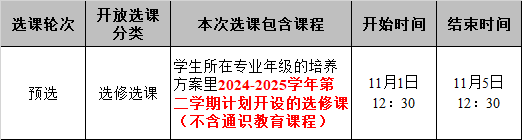 5.本次选课结束后,能满足开课条件的课程,本次选课结果有效,所选的选修课将预置进2024-2025学年第二学期的个人课表。