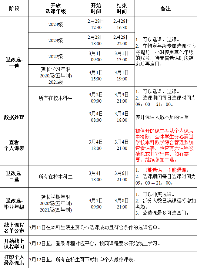 本次选课为2024-2025学年第二学期课程的最后一次选课,请同学们严格按照时间安排进行退改选。尤其要在规定的时间内查看课表,以免因课堂人数不足停开而导致漏选课程的情况。如未按规定时间参与选课或错过选课机会,后果自负。