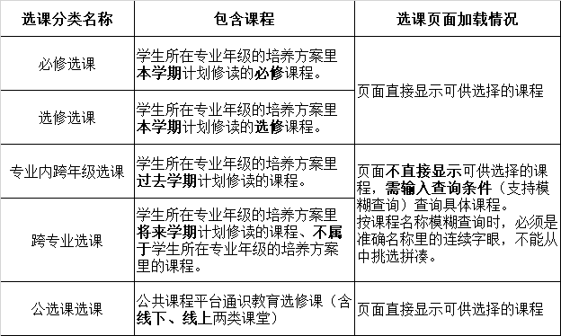 本次选课包含2024-2025-2学期开设的所有课程。部分课程有限选专业、限选班级设置。对于不同年级不同专业的学生,各类课程可能显示在不同选课分类里,学生可在所有选课分类里搜索查找。如确实未查询到需修读的课程,请到学生所在校区的教务管理办公室现场咨询。