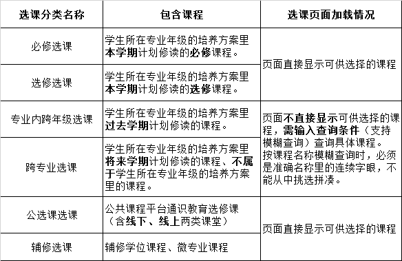 学校本科教学综合管理系统是查询培养方案、课表、选课、成绩等教学信息的唯一渠道,勿使用其他手机APP、微信小程序。请学生们一定以学校本科教学综合管理系统里的信息为准,按时间要求查看课表(其他渠道的软件程序不能保证准确、不能即时更新数据)。选课分类说明见下表。