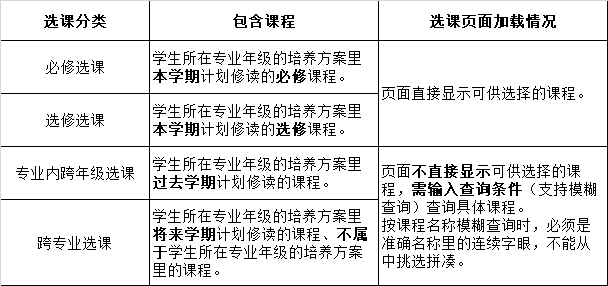学校本科教学综合管理系统是查询培养方案、课表、选课、成绩等教学信息的唯一渠道,勿使用其他手机APP、微信小程序。请同学们一定以学校本科教学综合管理系统里的信息为准,其他渠道的软件程序不能保证即时更新数据、不能显示未安排具体上课时间的课程,按时间要求查看课表。选课分类说明如下: